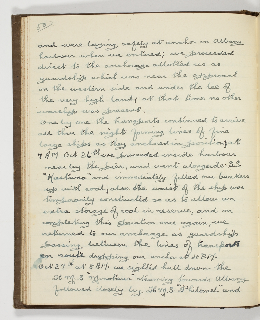 Oct 27th at 8 A.M. we sighted hull down the M.S. "Minotaur" steaming towards Albany followed closely by H.M.S. "Philomel" and
