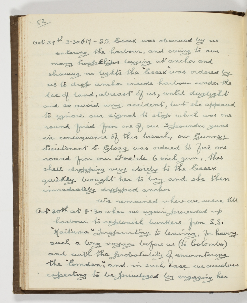 Oct 29th [1914] 3-30 AM – S.S. Essex was observed by us entering the harbour, and owing to our many troopships laying at anchor and showing no lights the "Essex" was ordered by us to drop anchor inside the harbour under the lee of land, abreast of us, until day light and so avoid any accident,- but she appeared to ignore our signal to stop which was one round fired from one of our 3 pounder guns – in consequence of this breach, our Gunnery Lieutenant E. Gloag was ordered to fire one round from our Fox'cle 6 inch gun, this shell dropping very closely to the Essex quickly brought her to bay and she then immediately dropped anchor