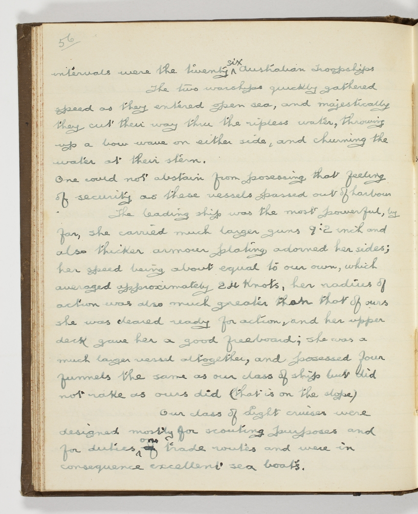 intervals were twenty six Australian Troopships – The two warships quickly gathered speed as they entered open sea, and majestically they cut their way thru the ripless water, throwing up a bow wave on either side, and churning the water at their stern. One could not abstain from possessing that feeling of security as these vessels passed out of harbour