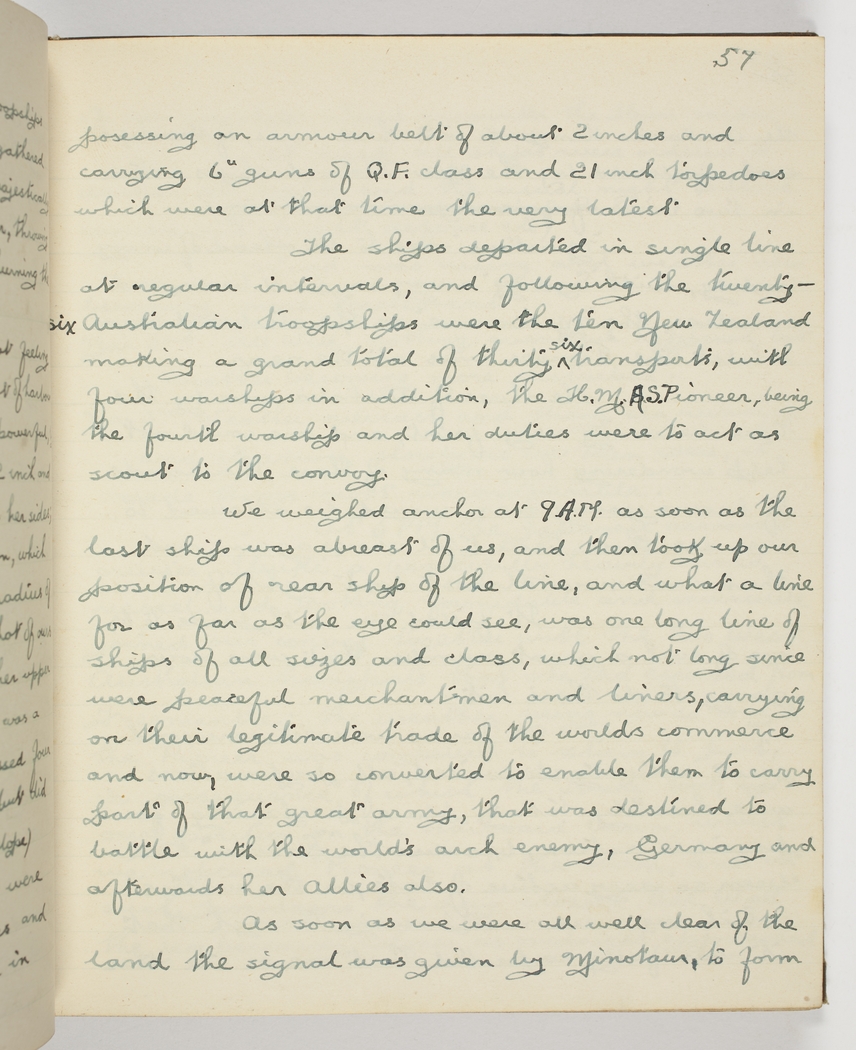 The ships departed in single line at regular intervals, and following the twenty-six Australian troopships were the ten New Zealand making a grand total of thirty six transports, with four warships in addition, the H.M.A.S. Pioneer, being the fourth warship and her duties were to act as scout to the convoy.