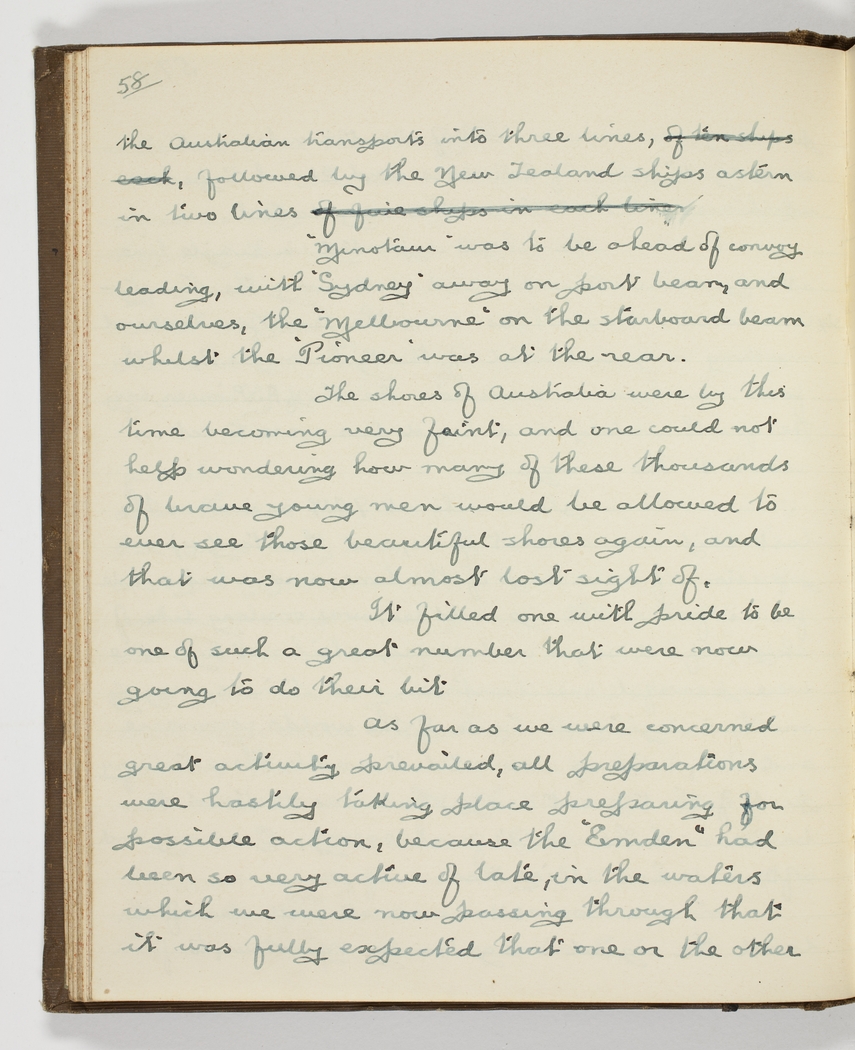the Australian transports into three lines, of ten ships each followed by the New Zealand ships astern in two lines of five ships in each line Minotaur was to be ahead of convoy leading, with "Sydney" away on port beam and ourselves, the "Melbourne" on the starboard beam whilst "Pioneer" was at the rear.