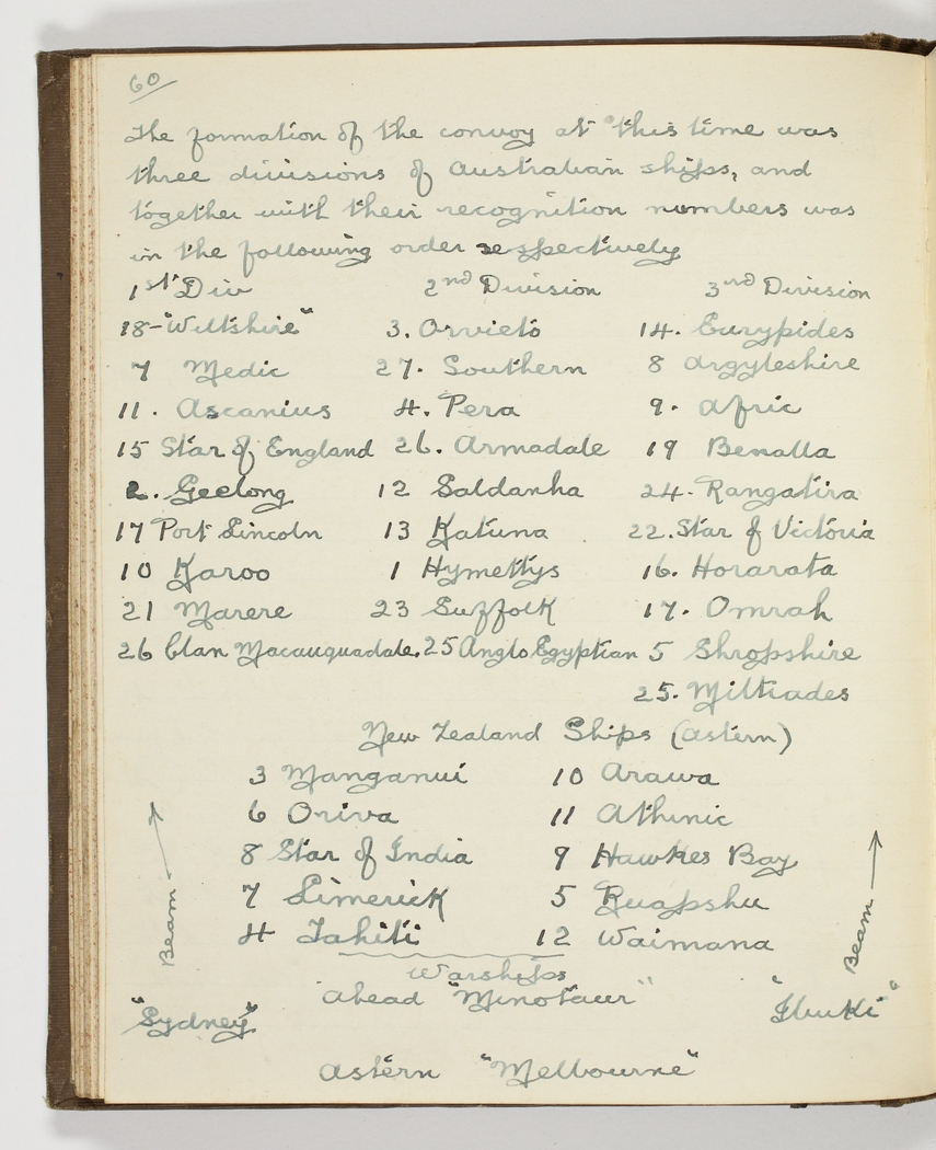 The formation of the convoy at this time was three divisions of Australian ships, and together with their recognition numbers was in the following order respectively