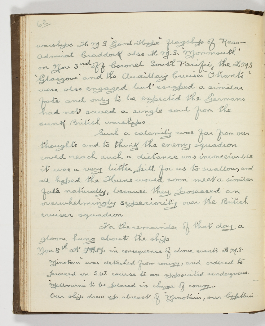warship HMS "Good Hope" flagship of Rear-Admiral Craddock also HMS "Monmouth" on Nov 3rd off Coronel [Chile] South Pacific, the HMS "Glasgow" and the Auxillary Cruiser "Otranto" were also engaged but escaped a similar fate and only to be expected the Germans had not saved a single soul from the sunk British warships – Such a calamity was far from our thoughts and to think the enemy squadron could reach such a distance was inconceivable – it was a very bitter pill for us to swallow, and all hoped the Huns would soon meet a similar fate naturally, because they posessed overwhelming superiority over the British cruiser squadron – For the remainder of that day a gloom hung about the ship