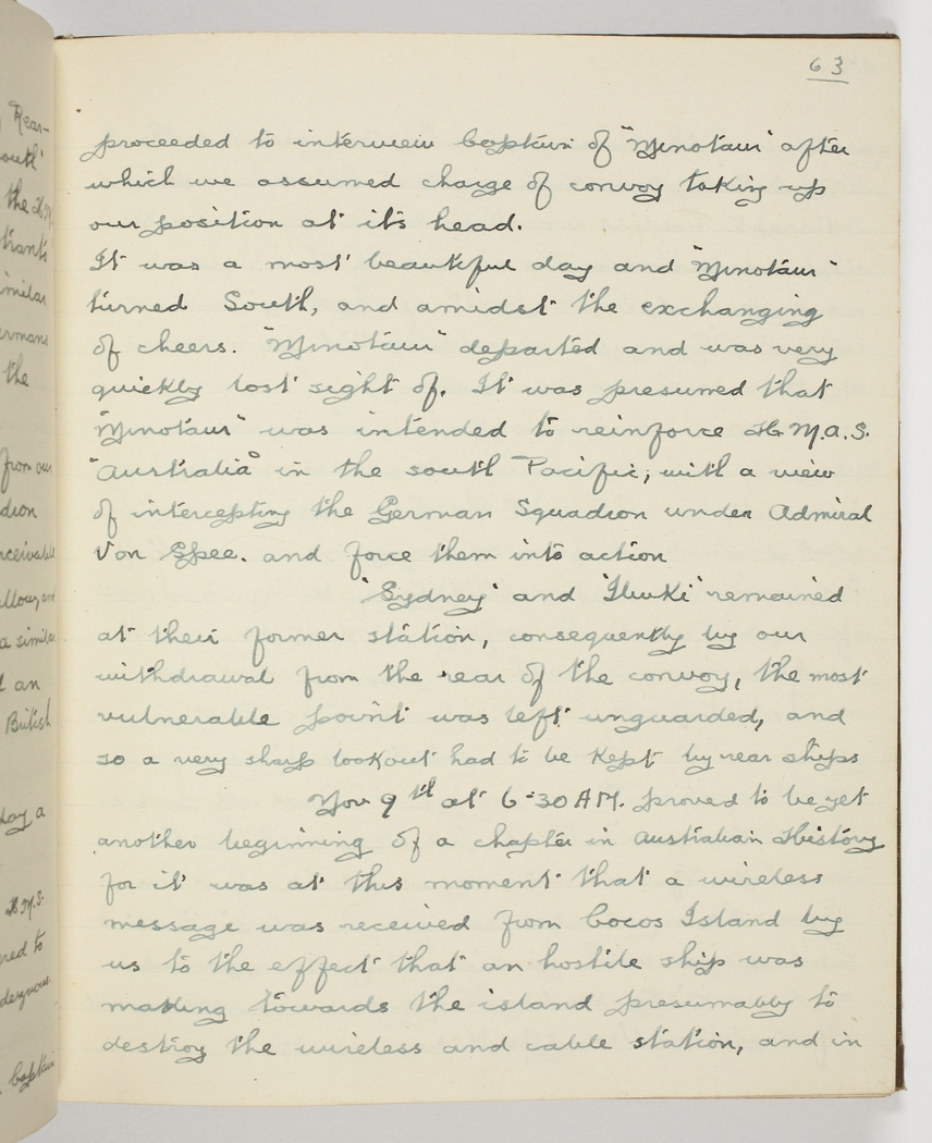 proceeded to interview Captain of "Minotaur" after which we assumed charge of convoy taking up our position at its head. It was a most beautiful day and "Minotaur" turned South, and amidst the exchanging of cheers, "Minotaur" departed and was very quickly lost sight of. It was presumed that "Minotaur" was intended to reinforce H.M.A.S. "Australia" in the South Pacific, with a view of intercepting the German Squadron under Admiral Von Spee, and force them into action