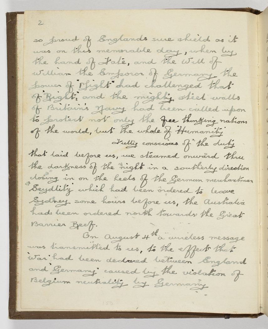 Fully conscious of the duty that laid before us, we steamed onward thru the darkness of the night in a southerly direction closing in on the heels of the German merchantman 'Seydlitz' which had been ordered to leave Sydney some hours before us, the Australia had been ordered north towards the Great Barrier Reef.