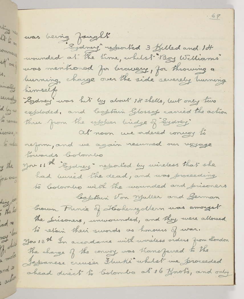 Nov 11th [1914] "Sydney" reported by wireless that she had buried the dead, and was proceeding to Colombo with the wounded and prisoners – Captain Von Muller and German Crown Prince of Hohenzollern was amongst the prisoners, and they were allowed to retain their swords as honours of war.