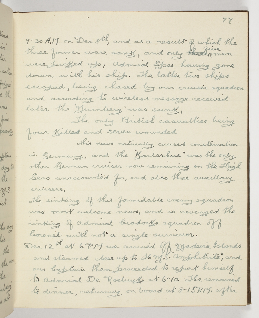 7.30 A.M. on Dec 8th, and as a result of which the three former were sank, and only five men were picked up, Admiral Spee having one down with his ship. The latter two ships escaped, being chased by our cruiser squadron and according to wireless message received later the "Nurnberg" was sunk, [plus the Leipzig, only the Dresden escaped] The only British casualties being four killed and seven wounded