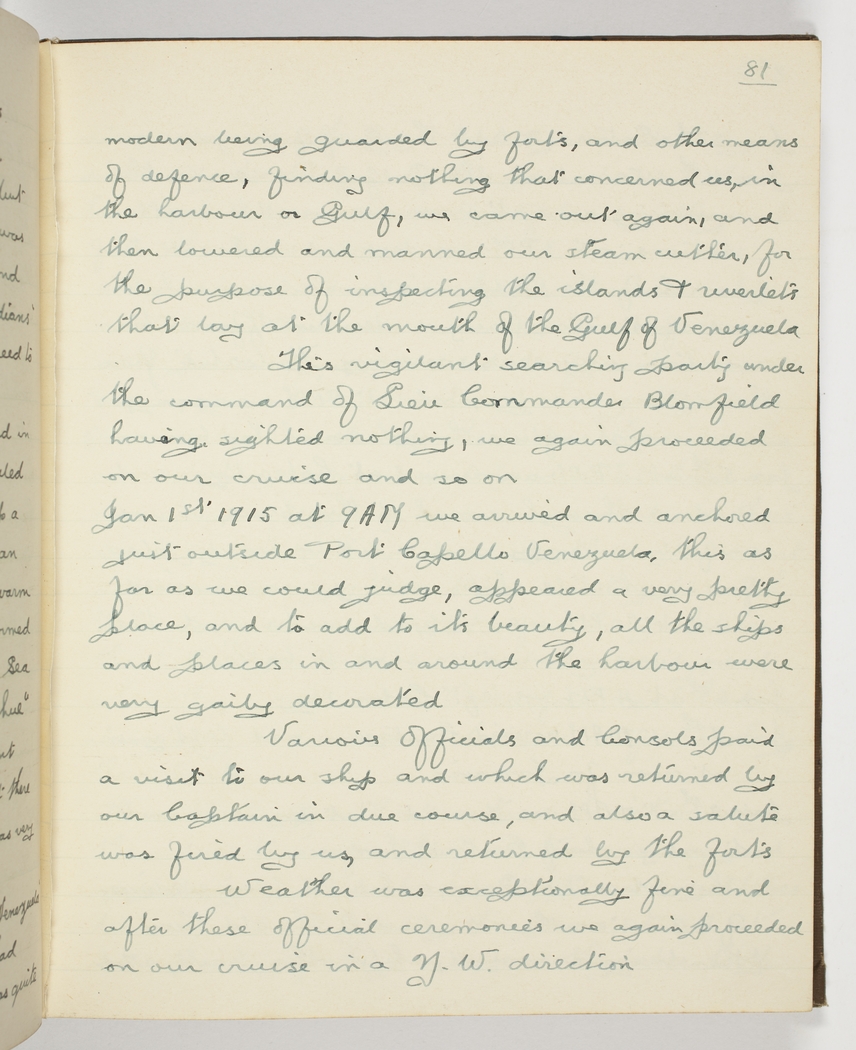 Jan 1st 1915 at 9 AM we arrived and anchored just outside Port Capello Venezuela,- this as far as we could judge, appeared a very pretty place, and to add to its beauty, all the ships and places in and around the harbour were very gaily decorated – Various officials and Consuls paid a visit to our ship and which was returned by our Captain in due course, and also a salute was fired by us, and returned by the forts – Weather was exceptionally fine and after theses official ceremonies we again proceeded on our cruise in a N.W. direction
