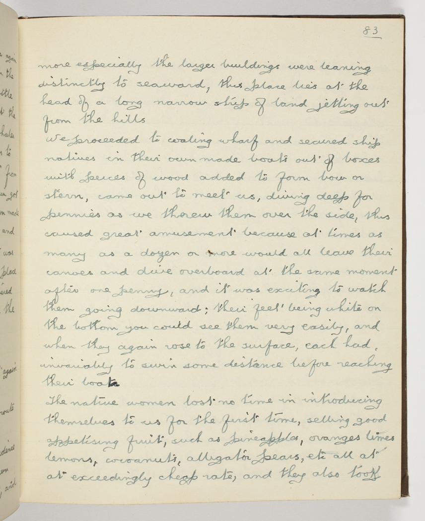We proceeded to coaling wharf and secured ship – natives in their own made boats out of boxes with pieces of wood added to form the bow or stern, came out to meet us, diving deep for pennies as we threw them over the side, - this caused great amusement because at times as many as a dozen or more would all leave their canoes and dive overboard at the same moment after one penny, - and it was exciting to watch them going downwards; their feet being white on the bottom you could see them very easily, and when they again rose to the surface, each had invariably to swim some distance before reaching their boat