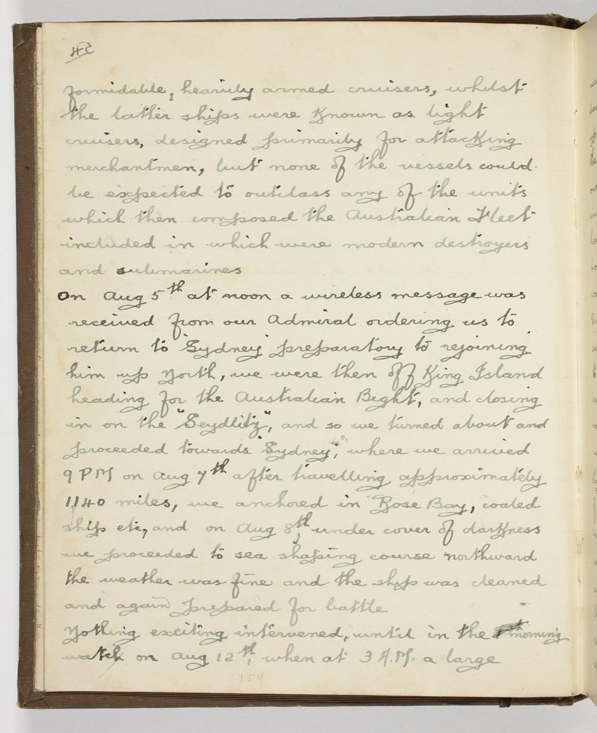 On Aug 5th [1914] at noon a wireless message was received from our Admiral ordering us to return to Sydney preparatory to rejoining him up north, we were then off King Island heading for the Australian Bight, and closing in on the "Seydlitz", and so we turned about and proceeded towards Sydney, where we arrived 9 PM on Aug 7th - after travelling approximately 1140 miles, we anchored in Rose Bay, coaled ships etc, and on Aug 8th, under cover of darkness we proceeded to sea shaping course northward the weather was fine and the ship was cleaned and again prepared for battle.