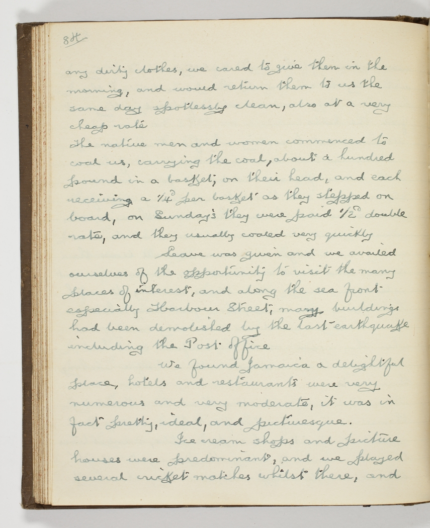 Leave was given and we availed ourselves of the opportunity to visit the many places of interest, and along the sea front especially Harbour Street, - many buildings had been demolished by the last earthquake including the Post Office – We found Jamaica a delightful place, hotels and restaurants were very numerous and very moderate, it was in fact pretty, ideal, and picturesque. Ice cream shops and picture houses were predominant, and we played several cricket matches whilst there, and