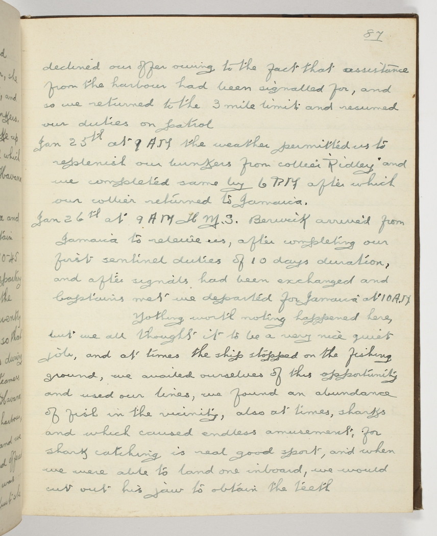 Jan 26th at 9 AM H.M.S. Berwick arrived from Jamaica to relieve us, after completing our first sentinel duties of 10 days duration, and after signals had been exchanged and Captains met we departed for Jamaica at 10 A.M.