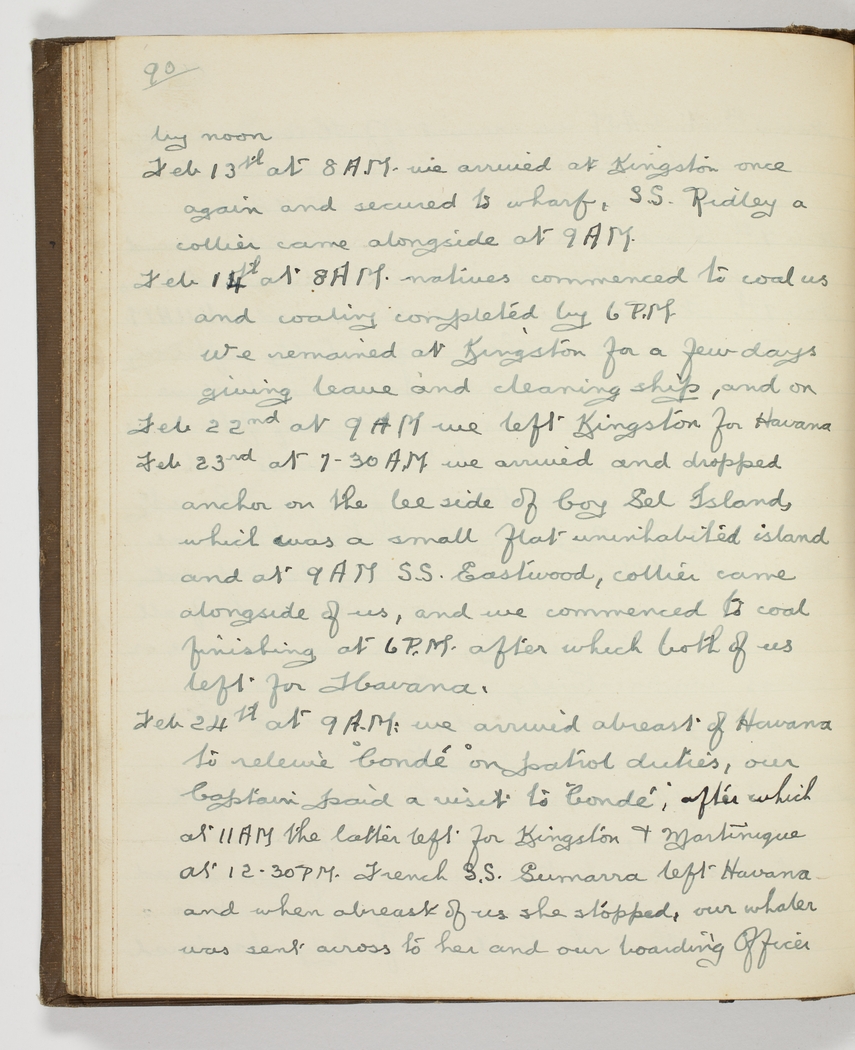 Feb 13th [1915] at 8 A.M. we arrived at Kingston once again and secured to wharf, S.S. Ridley a collier came alongside at 9 A.M.