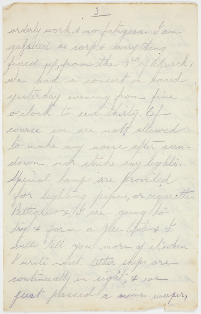 We had a concert on board yesterday evening from five o'clock to six, thirty. Of course we are not allowed to make any noise after sun-down, nor strike any lights. Special lamps are provided for lighting pipes, or cigarettes. Pettigrew & I are going to try & form a Glee Club & I will tell you more of it, when I write next. Other ships are continually in sight, & we just passed a mine sweeper,
