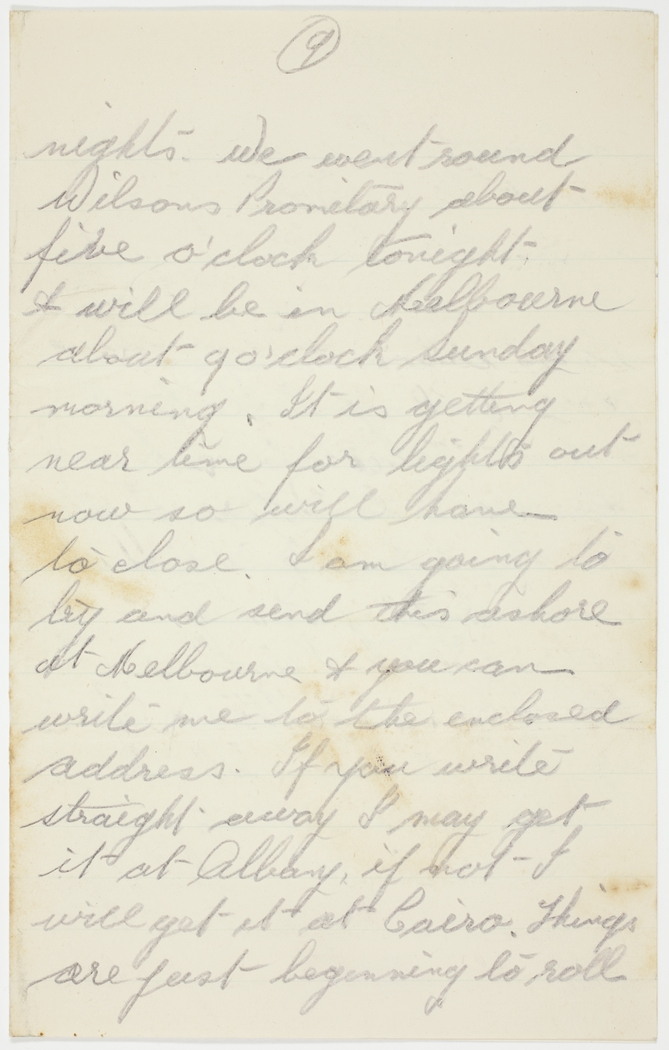 nights. We went round Wilsons Promitory about five o'clock tonight & will be in Melbourne about 9 o'clock Sunday morning. It is getting near time for lights out now so will have to close. I am going to try and send this ashore at Melbourne & you can write me to the enclosed address. If you write straight away I may get it at Albany, if not I will get it at Cairo. Things are just beginning to roll