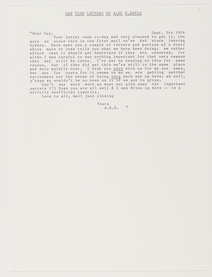 Your letter came to-day and very pleased to get it, the more so since this is the first mail we've had since leaving Sydney. Have sent you a couple of letters and portion of a diary which more or less tells you what we have been doing; am rather afraid lest it should get destroyed if they are censored, for altho I was careful to say nothing important for that very reason they may still be taboo. ve put no heading on this for same reason, but if they did get this we´re still in the same place and doin maistly nowt. I wish you were with us for my own sake, but not for yours for it seems to me we are getting neither excitement nor the sense of being very much use up here; ah well, p'raps we wouldn't be so keen on it if we got to grips.