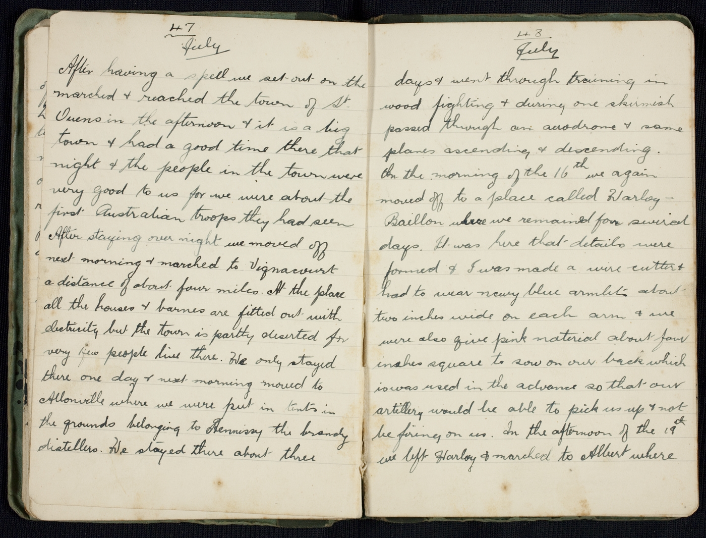 After having a spell we set out on the marched & reached the town of St Ouens in the afternoon & it is a big town & had a good time there that night & the people in the town were very good to us for we were about the first Australian troops they had seen. After staying over night we moved off next morning & marched to Vignacourt a distance of about four miles. At the place all the houses & barnes are fitted out with electricity but the town is partly deserted for very few people live there. We only stayed there one day & next morning moved to Allonville where we were put in tents in the grounds belonging to Hennissy the brandy distillers. We stayed there about three days & went through training in wood fighting & during one skirmish passed through an aerodrome & some planes ascending & descending.