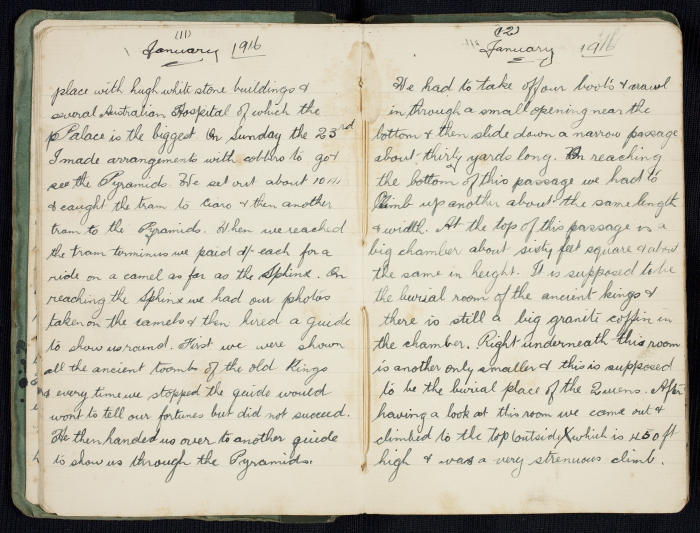 place with high white stone buildings & several Australian Hospital of which the Palace is the biggest. On Sunday the 23rd I made arrangements with cobbers to go & see the Pyramids. We set out about 10 am & caught the tram to Ciaro & then another tram to the Pyramids. When we reached the tram terminus we paid 2/- each for a ride on a camel as far as the Sphinx. On reaching the Sphinx we had our photos taken on the camels & then hired a guide to show us round. First we were shown all the ancient toombs of the old Kings & every time we stopped the guide would wont to tell our fortunes but did not succeed. He then handed us over to another guide to show us through the Pyramids.