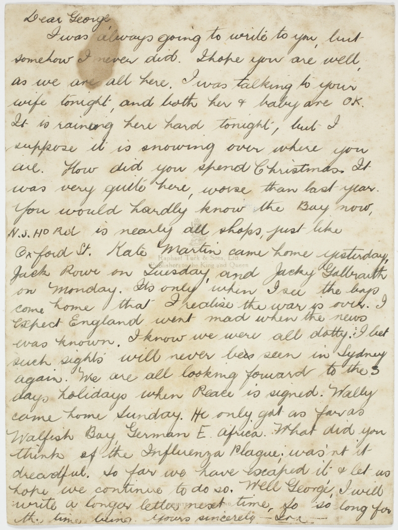 I expect England went mad when the news was known. I know we were all dotty. I bet such sight will never be seen in Sydney again. We are all looking forward to the 3 days holidays when Peace is signed. Wally came home Sunday. He only got as far as Walfish Bay German E Africa. What did you think of the Influenza Plague; wasn't it dreadful. So far we have escaped it and let us hope we continue to do so.
