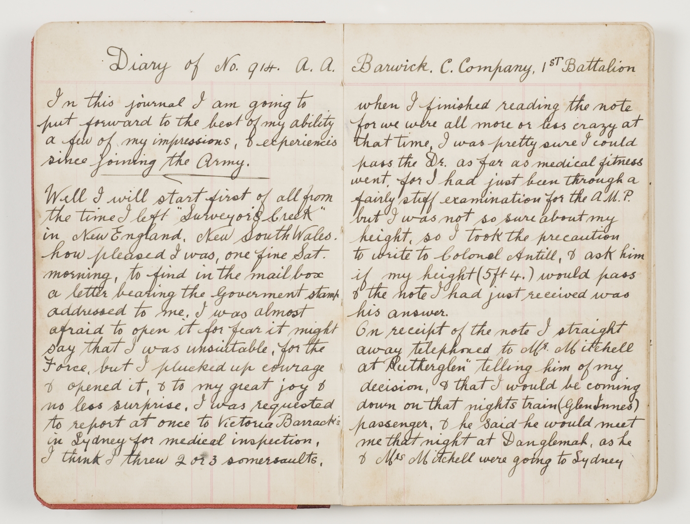 Well I will start first of all from the time I left "Surveyor's Creek" in New England, New South Wales. how pleased I was, one fine Sat. morning, to find in the mail box a letter bearing the Government stamp addressed to me, I was almost afraid to open it for fear it might say that I was unsuitable, for the Force, but I plucked up courage & opened it, & to my great joy & no less surprise, I was requested to report at once to Victoria Barrack's in Sydney for medical inspection, I think I threw 2 or 3 somersaults,