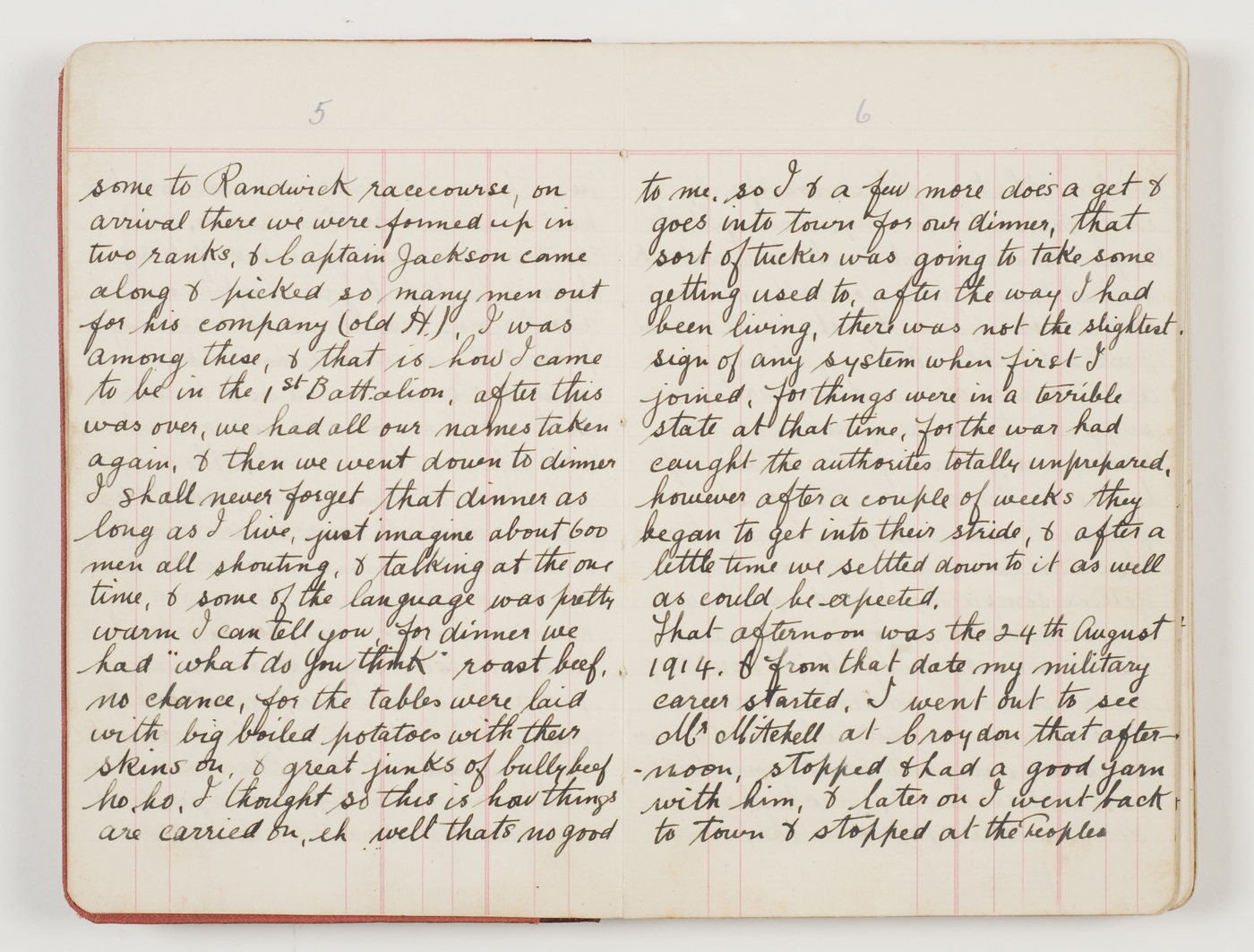 That afternoon was the 24th August 1914. & from that date my military career started. I went out to see Mr Mitchell at Croydon that afternoon, stopped & had a good yarn with him, & later on I went back to town & stopped at the Peoples
