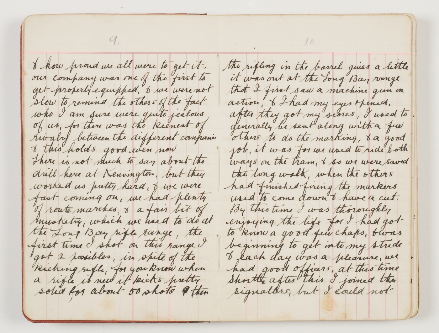 the rifling in the barrel gives a little it was out at the Long Bay range that I first saw a machine gun in action, & I had my eyes opened, after they got my scores, I used to generally be sent along with a few others to do the marking, & a good job, it was for we used to ride both ways on the tram, & so we were saved the long walk, when the others had finished firing the markers used to come down & have a cut. By this time I was thoroughly enjoying the life for I had got to know a good few chaps, & was beginning to get into my stride & each day was a pleasure, we had good officers, at this time Shortly after this I joined the signallers, but I could not