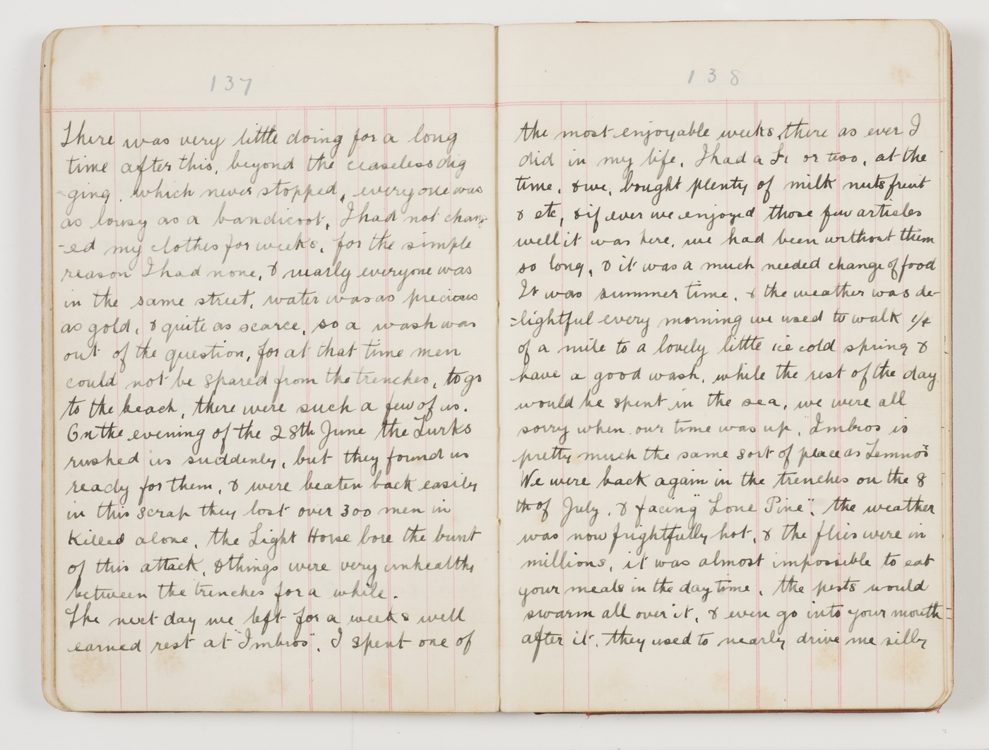 the most enjoyable weeks there as ever I did in my life, I had a £ 1 or two, at the time, & we, bought plenty of milk nuts fruit & etc, & if ever we enjoyed those few articles well it was here, we had been without them so long, & it was a much needed change of food. It was summer time, & the weather was delightful every morning we used to walk ¼ of a mile to a lovely little ice cold spring & have a good wash, while the rest of the day would be spent in the sea, we were all sorry when our time was up, Imbros is pretty much the same sort of place as Lemnos. We were back again in the trenches on the 8th of July, & facing "Lone Pine", the weather was now frightfully hot, & the flies were in millions, it was almost impossible to eat your meals in the day time, the pests would swarm all over it, & even go into your mouth after it, they used to nearly drive me silly