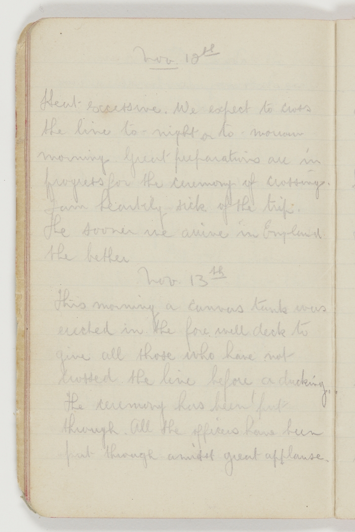 This morning a canvas tank was erected in the fore well deck to give all those who have not crossed the line before a ducking.   The ceremony has been put through.   All the officers have been put through amidst great applause.