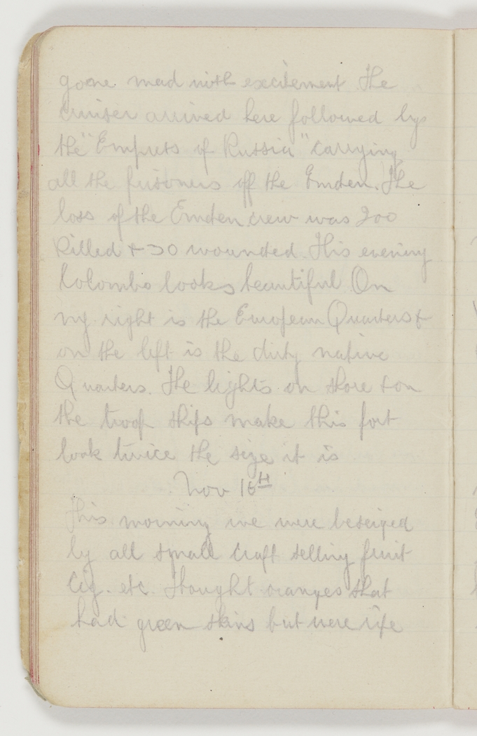 gone mad with excitement. The Cruiser arrived here followed by the "Empress of Russia" carrying all the prisoners off the Emden. The loss of the Emden crew was 200 killed & 30 wounded. This evening Colombo looks beautiful. On my right is the European Quarters & on the left is the dirty native Quarters. The lights on shore for the troop ships make this port look twice the size it is.