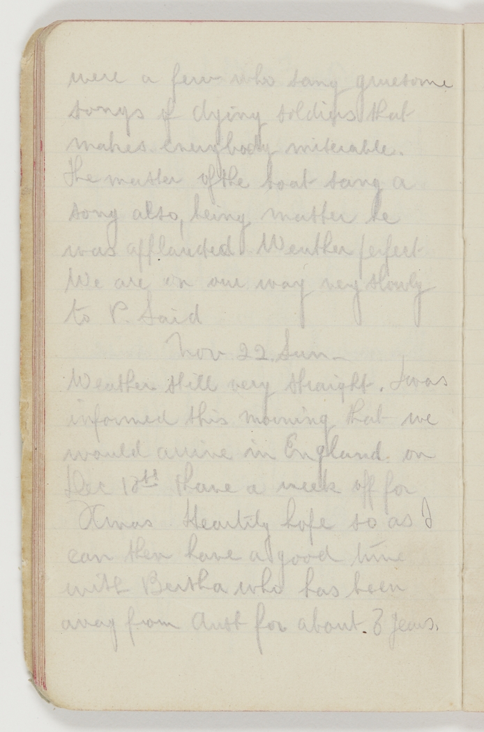 Weather still very straight. I was informed this morning that we would arrive in England on Dec. 18th & have a week off for Xmas. Heartily hope so as I can then have a good time with Bertha who has been away from Aust for about 8 years.