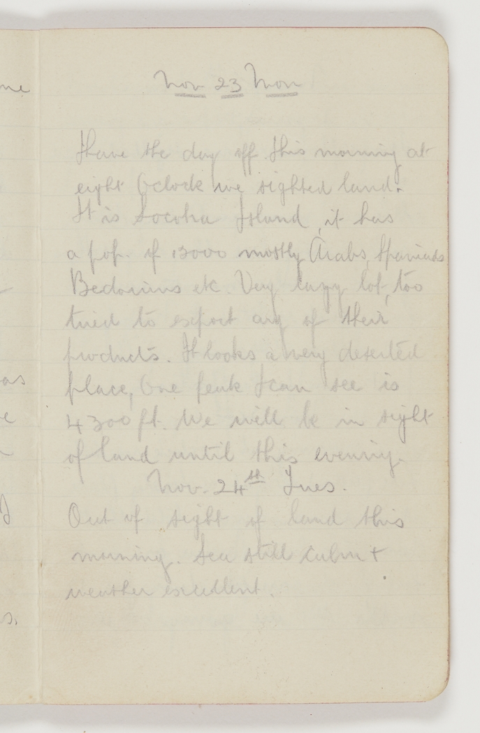 I have the day off. This morning at eight oclock we sighted land. It is Socotra Island, it has a pop. of 12000 mostly Arabs, Spaniads, Bedouins etc. Very lazy lot, too tired to export any of their products. It looks a very deserted place, one peak I can see is 4300 ft. We will be in sight of land until this evening.