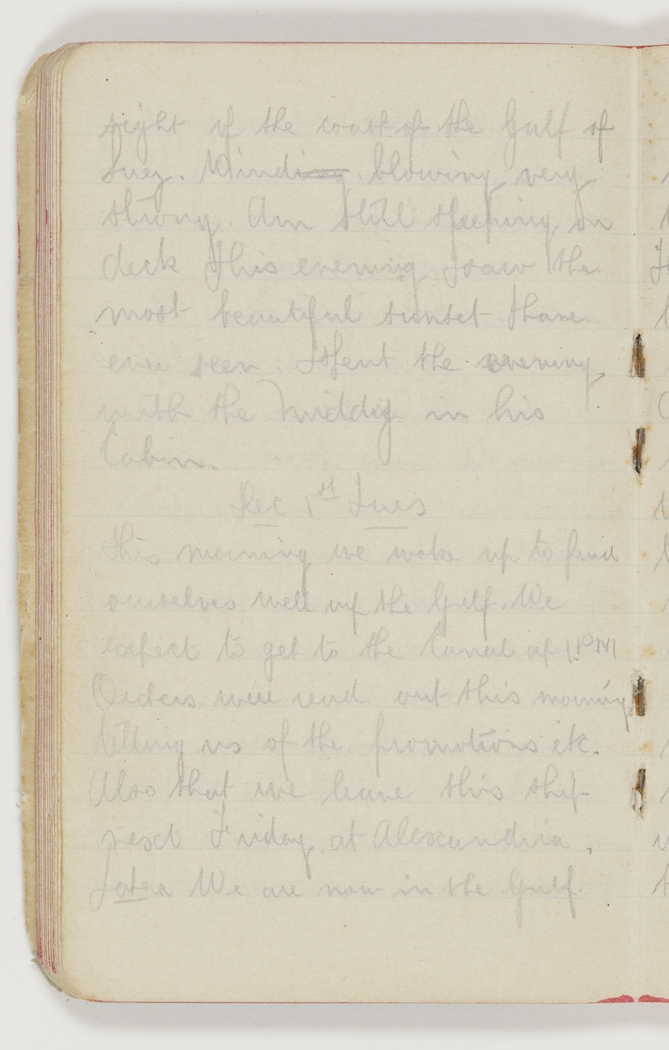 sight of the coast of the Gulf of Suez. Winding blowing very strong. Am still sleeping on deck. This evening I saw the most beautiful sunset I have ever seen. I spent the evening with the Middy in his cabin.