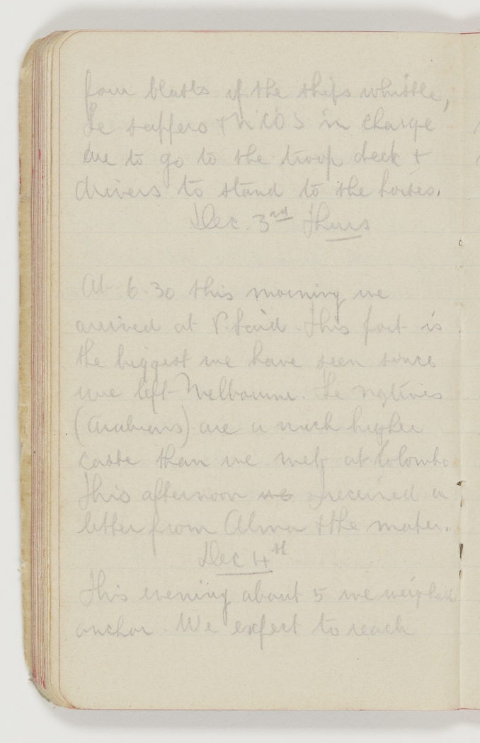 At 6.30 this morning we arrived at P. Said. This port is the biggest we have seen since we left Melbourne. The natives (Arabians) are a much higher caste than we met at Colombo. This afternoon we I received a letter from Alma & the mater.
