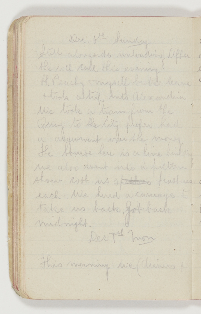 Still alongside unloading. After the roll call this evening H. Peachy & myself broke leave and took a trip into Alexandria. We took a tram from the Quay to the City proper, had a argument over the money. The bourse here is a fine building. We also went into a picture show cost us 2 piastres each. We hired a carriage to take us back. Got back midnight.