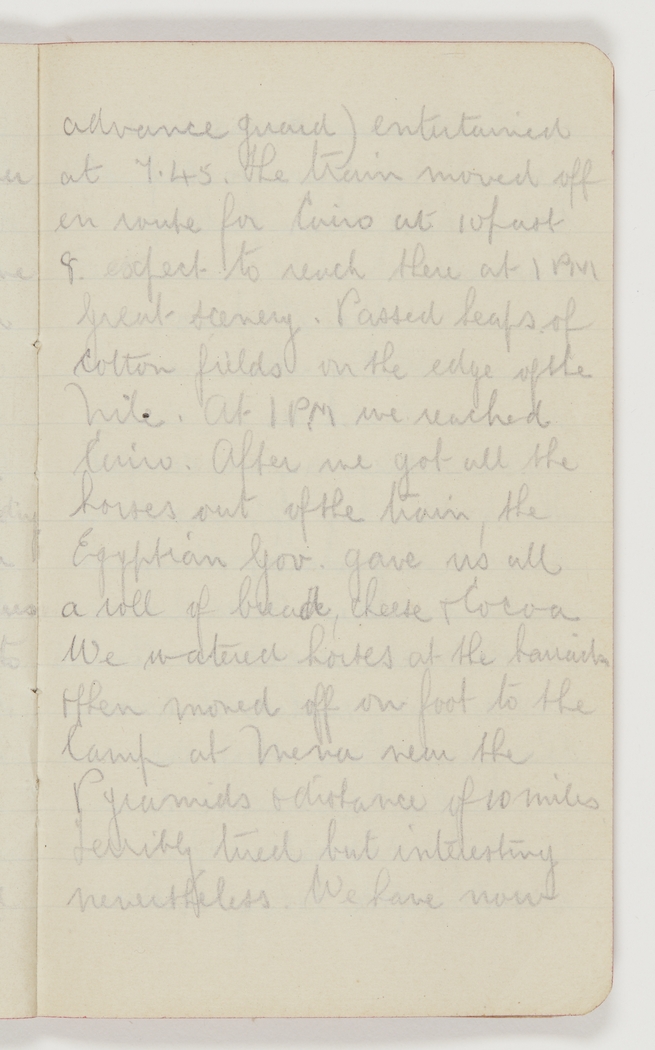 advance guard) entertained at 7.45. The train moved off en route for Cairo at 10 past 8. Expect to reach there at 1 p.m. Great scenery. Passed heaps of cotton fields on the edge of the Nile. At 1 p.m. we reached Cairo. After we got all the horses out of the train, the Egyptian Gov. gave us all a roll of bread, cheese & cocoa. We watered horses at the barracks & then moved off on foot to the Camp at Mena near the Pyramids, a distance of 10 miles, terribly tired but interesting nevertheless. We have now
