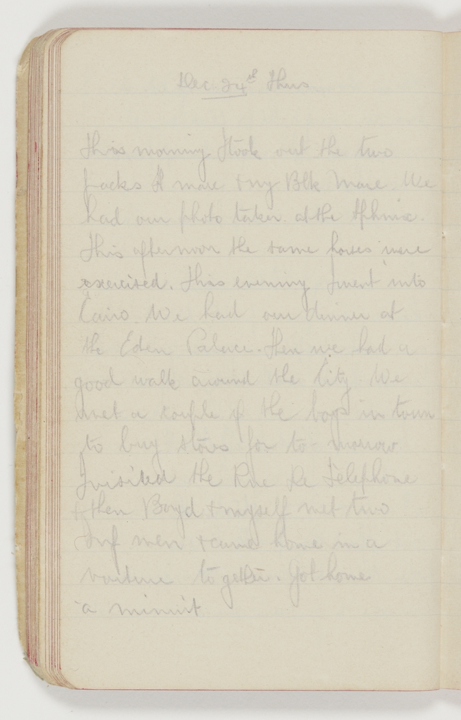 This morning I took out the two packs a mare & my Blk mare. We had our photo taken at the Sphnix. This afternoon the same horses were exercised. This evening I went into Cairo. We had our dinner at the Eden Palace. Then we met a couple of the boys in town to buy stores for to-morrow. I visited the Rue De Tèlephone & then Boyd & myself met two Inf. men & came home in a voiture to-gether. Got home à minuit.