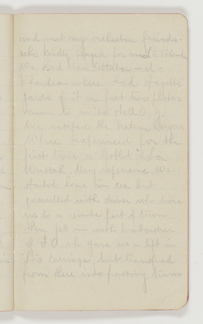 We had tea Attaba-el-Khardra [also spelt Ataba-el-Khadra] where I had spagetti yards of it in fact two plates. Mean to write and tell A.G. We visited the native Bazar where I experienced for the first time a Goblet à la Wassah. Very expensive. We started home in car but quarrelled with driver who drove us to a remote part of town. Then fell in with bombardier of F.A. [Field Ambulance] who gave us a lift in his carriage, but transfered from there into passing tram