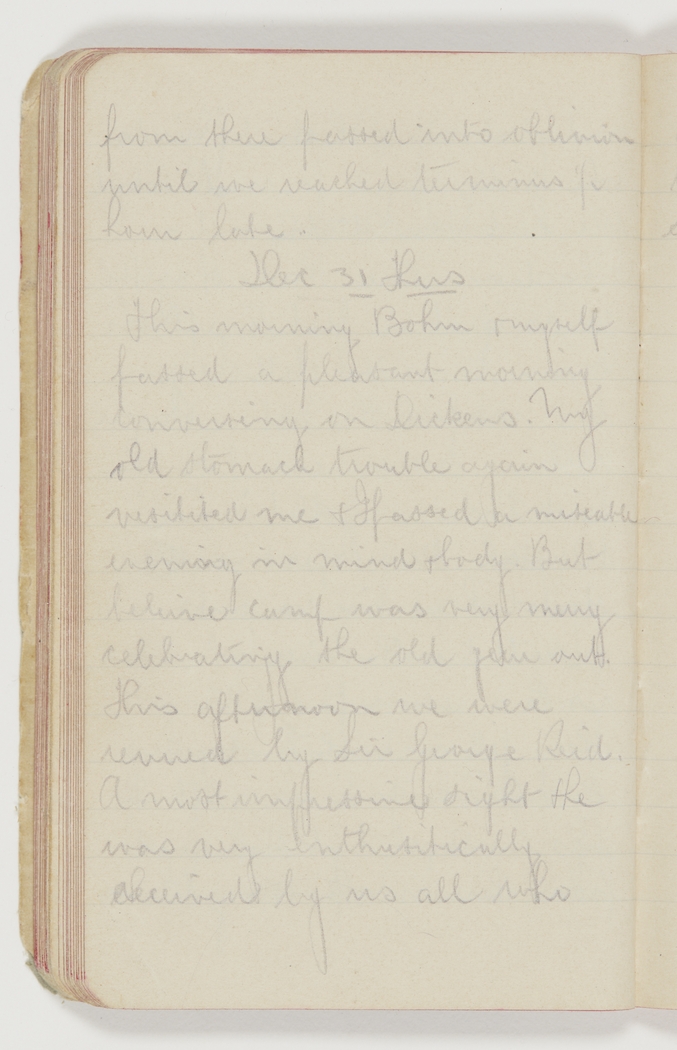 This evening Bohm & myself passed a pleasant morning conversing on Dickens. My old stomach trouble again visited me & I passed a miserable evening in mind & body. But beleive camp was very merry celebrating the old year out. This afternoon we were reviewed by Sir George Reid. A most impressive sight & he was very enthusitically [enthusiastically] received by us all who