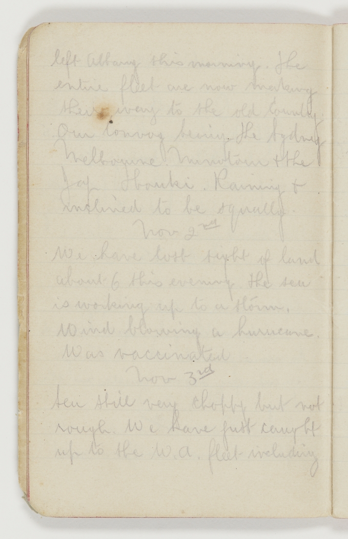 left Albany this morning. The entire fleet are now making their way to the old country, our convoy being the Sydney Melbourne Minotaur and the Jap Ibuki . Raining & inclined to be squally.
