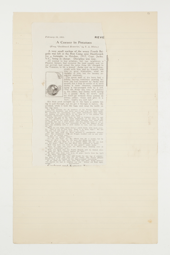 The next norming the 20 members of the Fourth Brigade had potatoes for breakfast, and Jacka and I had them for three meals. We repeated the souveniring each night immediately after lights out, keeping our fellow-officers in the dark as to our method, but becoming wonderfully popular with them.