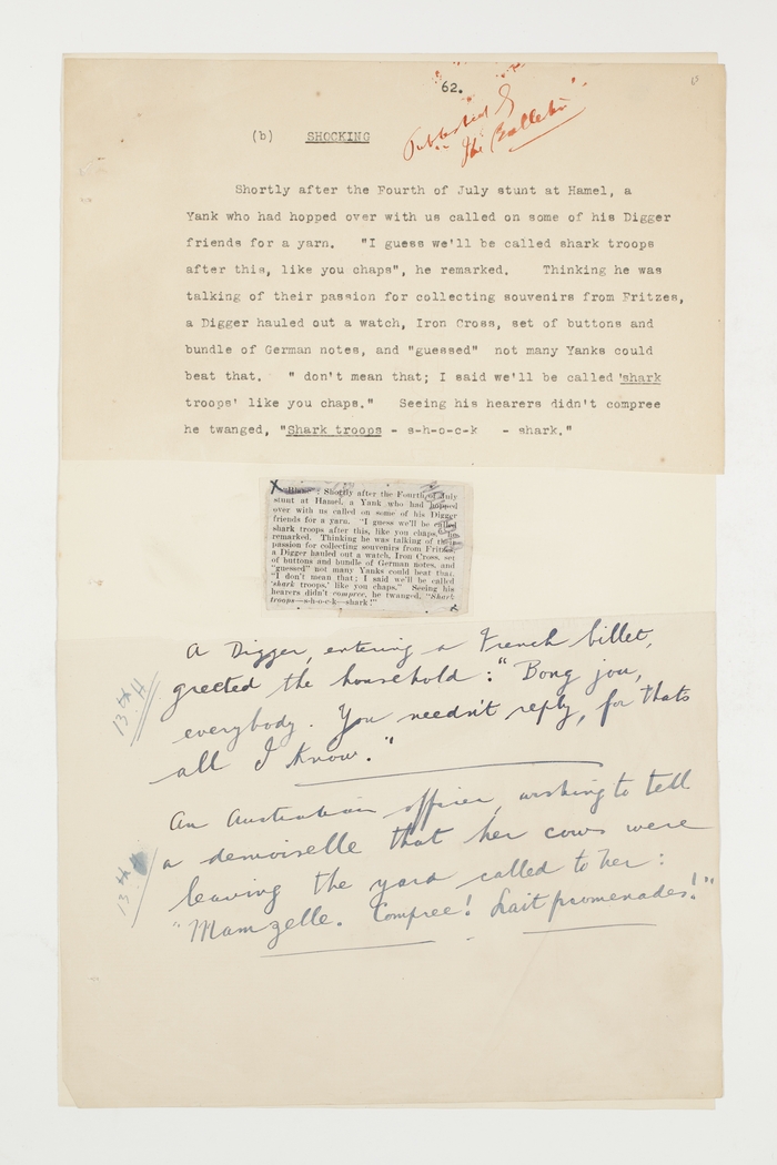 Shortly after the Fourth of July stunt at Hamel, a Yank who had hopped over with us called on some of his Digger mates for a yarn. "I guess we'll be called shark troops after this, like you chaps", he remarked. Thinking that he was talking of their passion for collecting souvenirs from Fritzes, a Digger hauled out a watch, Iron Cross, set of buttons, and bundle of German notes and "guessed" not many Yanks could beat that. "don't mean that; I said we'll be called 'shark troops' like you chaps." Seeiing his hearers didn't compree he twanged "Shark troops - s-h-o-c-k - shark."