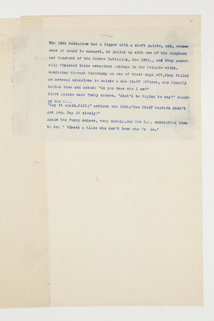 The 15th Battalion had a Digger with a cleft palate, and, whenever it could be managed, he palled up with one of the roughest and toughest of the Sister Battalion, the 13th, and they generally finished their estaminet outings in the Brigade clink.