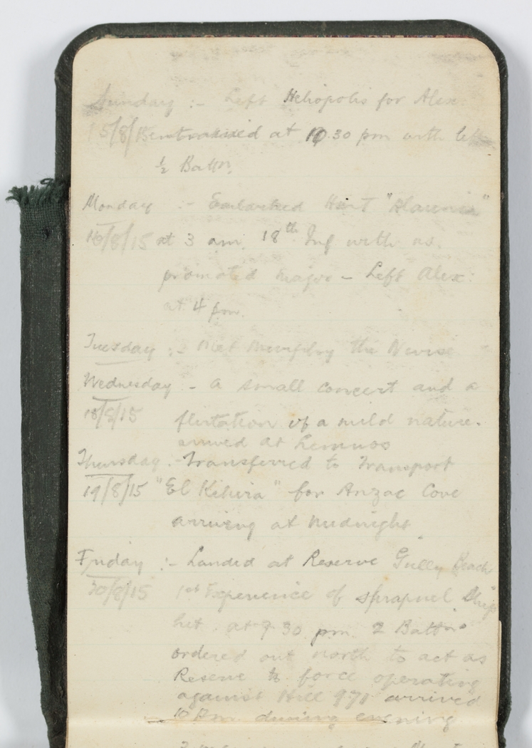 Thursday 19/8/15 Transferred to Transport "El [Kilura?]" for Anzac Cove arriving at midnight.