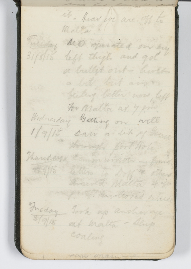 Tuesday 31/8/15 M.O. operated on my left thigh and got a bullet out - hurt a bit but am feeling better now, left For Malta at 7 pm.