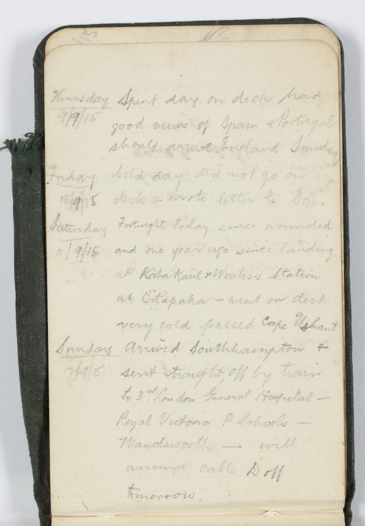 Sunday 12/9/15 Arrived Southampton & sent straight off by train to 3rd London General Hospital - Royal Victoria P [Patriotic] Schools - Wandsworth - will arrange cable Doff tomorrow