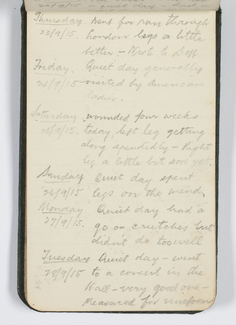 Saturday 25/9/15 wounded four weeks today, left leg getting along splendidly - Right leg a little bit sore yet.