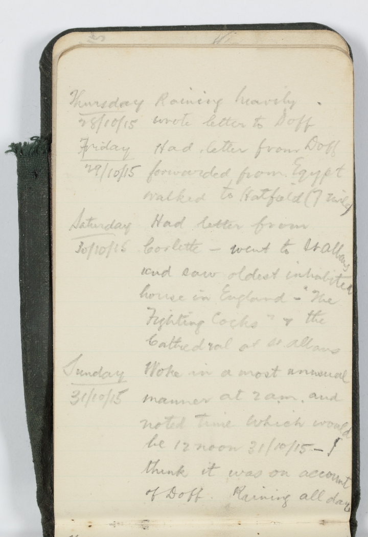 Saturday 30/10/15 Had letter from Corlette - went to St Albans and saw oldest inhabited house in England - "The Fighting Cocks" & the Cathedral at St Albans