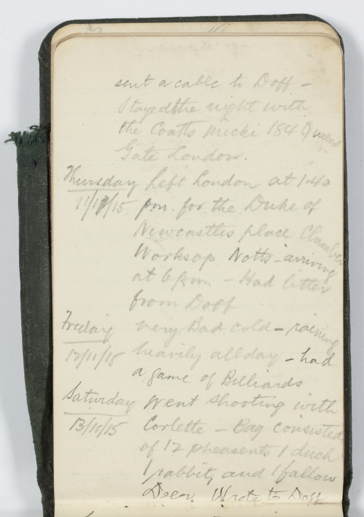 Thursday 11/11/15 Left London at 1.40 pm. for the Duke of Newcastles place Clumber [Park] Worksop Notts - arriving at 6 pm. - Had letter from Doff