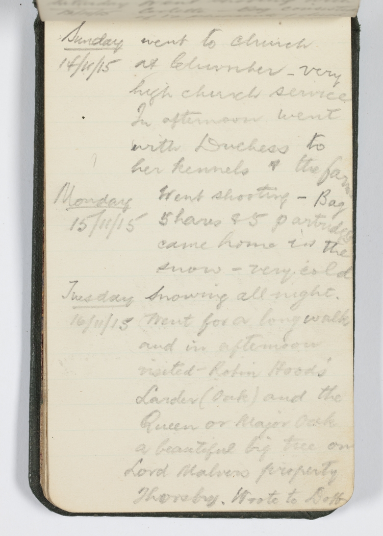 Tuesday 16/11/15 Snowing all night. Went for a long walk and in the afternoon visited Robin Hood's Larder (Oak) and the Queen or Major Oak a beautiful big tree on Lord Malvers [Manvers] property Thorsby (Park). Wrote to Doff