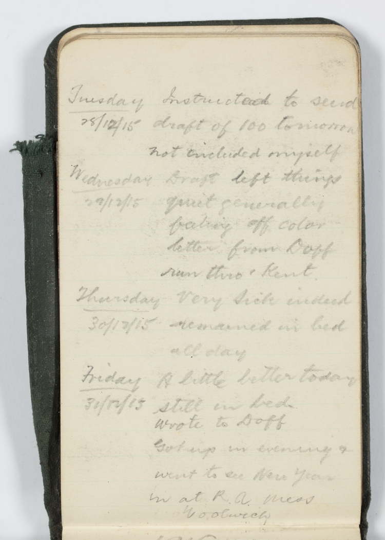 Friday 31/12/15 A little better today still in bed Wrote to Doff Got up in evening & went to see New Year in at R.A.Mess Woolwich
